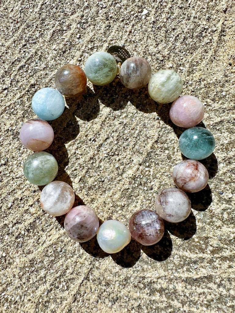 This beautifully hued bracelet is multi-colored Aquamarine with a luscious freshwater pearl with the center. Each bracelet will have its own unique coloring and comes in 2 sizes.